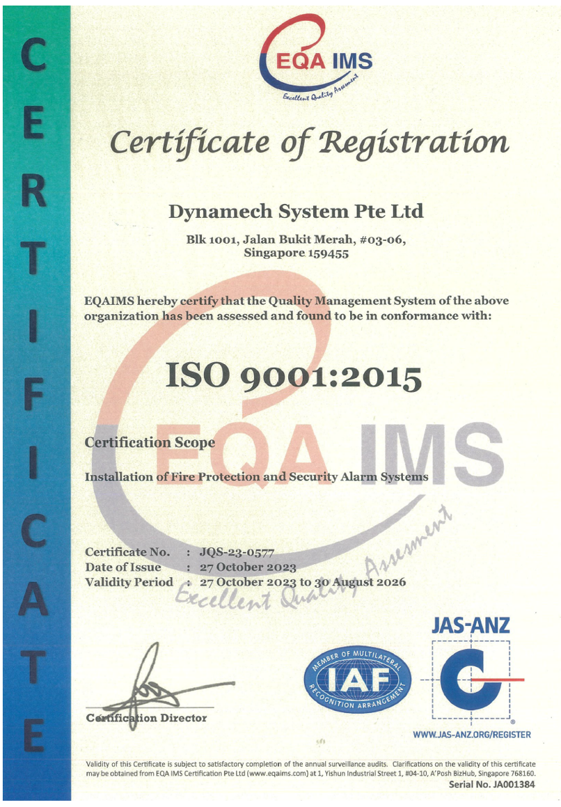 Incorporated in Singapore in 2015, Dynamech System specializes in Fire Protection Systems. Such systems include Fire Alarm System, Sprinkler System, Clean Agent System and Foam System in both the public and private sectors. For the past year, Dynamech System has grown progressively to its current strength.